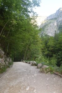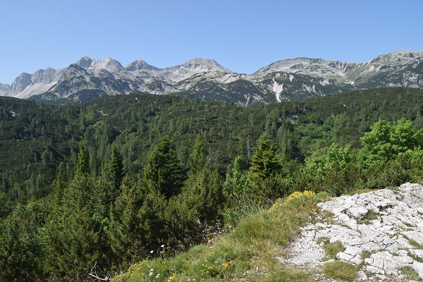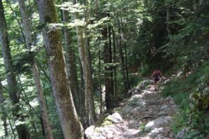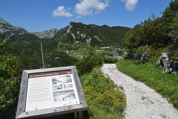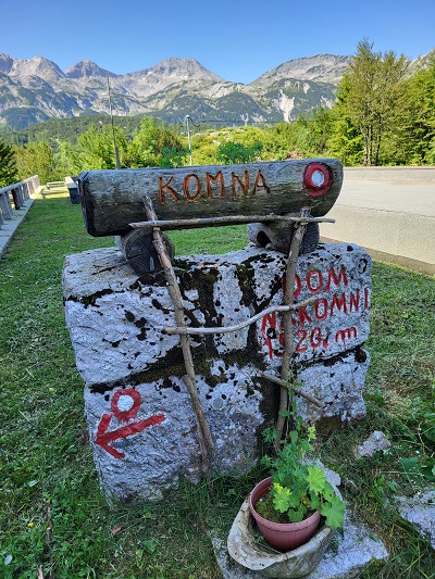 Od tu naprej nadaljujemo v dolino, kjer se pot zopet zložneje vzpenja in preide v bolj redek gozd iz katerega že lahko vidimo dom na Komni.