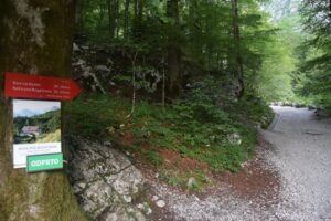 S parkirišča se usmerimo na pešpot v smeri proti slapu Savica. Že kmalu nas pot pripelje na označeno razpotje, kjer se desno odcepi pot proti slapu, mi pa nadaljujemo naravnost, po široki pešpoti v smeri Komne.