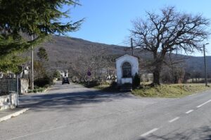 S parkirišča se peš podamo do glavne ceste, ki ji sledimo do križišča, kjer nas planinske oznake usmerijo levo mimo kapelice. Vzpenjajoči asfaltirani cesti sledimo do naslednjega križišča, kjer nas kažipot za lažjo pot usmeri levo na makadamsko cesto. Tam pa lahko izberemo tudi bolj strmo pot, ki pelje v gozd.