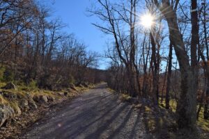 Izberete lahko daljšo, a položnejšo pot ter boste do vrha potrebovali dobro uro in pol prijetne hoje. Hodimo po široki gozdni makadamski cesti, ki večinoma poteka skozi gozd. Občasno se po cesti pripelje tudi kakšen avtomobil, čeprav naj bi bila cesta z zapornicami zaprta za promet. Je pa makadamska cesta primerna tudi za gorske kolesarje.